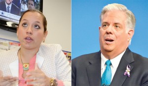 Maricé Morales (izq.), delegada estatal demócrata de Maryland por el Distrito 19, patrocina la Ley de la Confianza, pero el gobernador del estado, Larry Hogan, anuncia que la vetará.