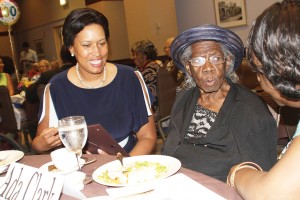 • La alcaldesa del Distrito de Columbia, Muriel Bowser, le hace entrega de un reconocimiento a Ada Clark, por ser la centenaria de mayor edad en la ceremonia. Clark tiene 106 años y lleva seis años participando de este evento. Foto: Álvaro Ortiz/Washington Hispanic.