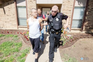 Una de las operaciones conducidas por agentes del ICE termina con el arresto de una persona a la que se identificó como miembro de una pandilla. Los rostros de los agentes y del arrestado aparecen borrosas por razones legales y de seguridad.