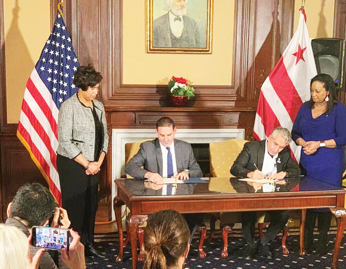 • La alcaldesa Muriel Bowser asiste el jueves 3 a la firma del memorando de entendimiento entre el alcalde de San Salvador, Ernesto Muyshondt (al centro), y Rudy Seikaly, fundador y CEO de la empresa MCN Build Foundation de DC, quien donó $500,000 para una futura biblioteca en la capital salvadoreña.