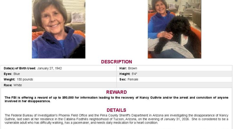 El FBI ofreció este jueves una recompensa de hasta 50.000 dólares por información que conduzca a la localización de Nancy Guthrie, la madre de la periodista Savannah Guthrie, copresentadora del programa matutino ‘TODAY’ de la cadena NBC, que se cree fue secuestrada en la madrugada del domingo en su casa en Arizona.